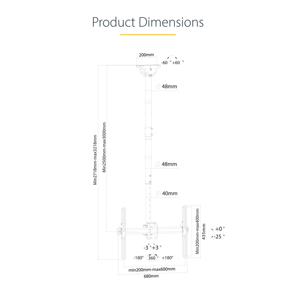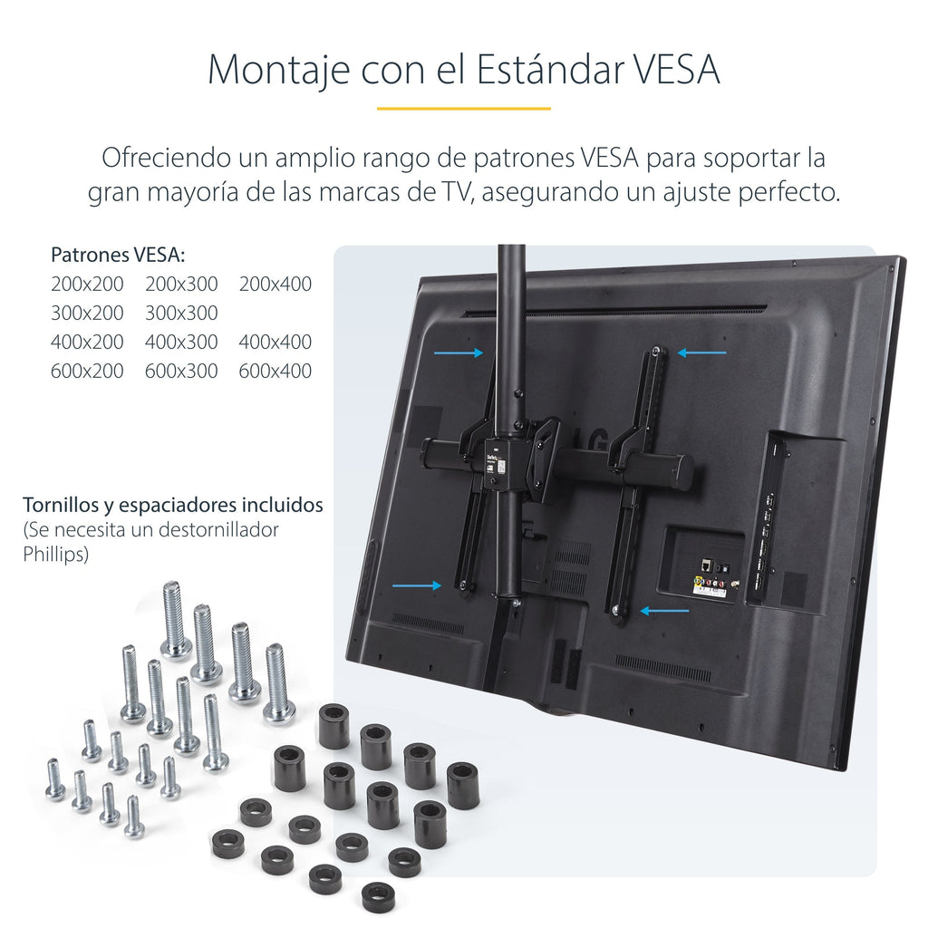 - ESTÉTICA ORDENADA: El soporte universal de techo para televisión para una pantalla grande proporciona un diseño de enganche y montaje para una fácil configuración y gestión integrada de cables - Ideal para aplicaciones de señalización digital.