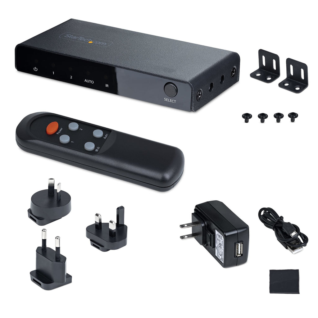Conmute entre dos fuentes de vídeo HDMI en una sola pantalla, con soporte para resoluciones de hasta 8K a 60HzEste conmutador de vídeo HDMI de 2 puertos permite conectar dos fuentes HDMI a una sola entrada HDMI de una pantalla.Resolución de 8K a 60HzEl conmutador HDMI admite resoluciones de hasta 8K 60Hz. Además, admite resoluciones inferiores con frecuencias de actualización más altas, como 4K 144Hz, 4K 120Hz y 1080p 240Hz.Este conmutador de vídeo es compatible con la norma HDMI 2.1 y admite funciones como la tasa de refresco variable (VRR), el modo de baja latencia automática (ALLM) y el control de la electrónica de consumo (CEC). Es retrocompatible con dispositivos HDMI 2.0 (e inferiores).Funcionamiento Automático o ManualEl Conmutador de vídeo 8K presenta tres opciones para seleccionar el dispositivo fuente. El modo automático detecta y selecciona el dispositivo fuente activado más recientemente o volverá al último dispositivo fuente activo. El modo manual selecciona el puerto deseado, utilizando los botones pulsadores, o con el mando a distancia incluido ( baterías no incluidas). El mando a distancia puede activar o desactivar el modo de conmutación automática y puede desactivar la funcionalidad IR.Opciones de Instalación FlexiblesUtilice el cargador de pared USB incluido y el USB Micro-B de 78 cm para alimentar la unidad. Si no se dispone de una toma de corriente, el conmutador 8K puede alimentarse también a través de un puerto USB de 5V a 1A.El kit de montaje incluido y las patas de goma permiten opciones de instalación versátiles. La carcasa metálica aumenta la durabilidad, lo que lo hace adecuado para su instalación y uso en una gran variedad de entornos.Este producto está respaldado durante 2 años por StarTech.com, incluyendo asistencia técnica multilingüe gratuita 24/5.The StarTech.com Advantage
