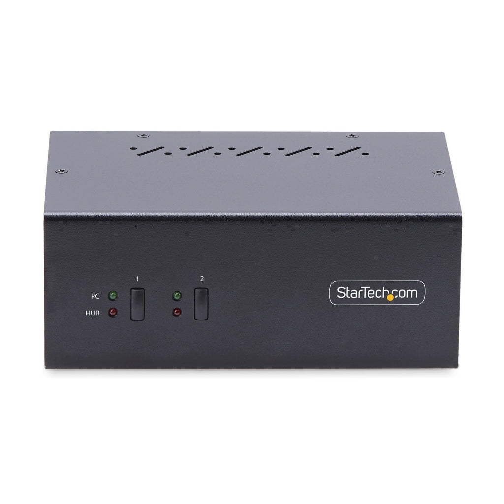- MÚLTIPLES OPCIONES DE CONMUTACIÓN: Conmutación por botones de conmutación o teclas de acceso - Timbre de confirmación de operaciones - LED para un rápido estado visual de la selección de puertos - Utilice el audio de un ordenador mientras controla el otro