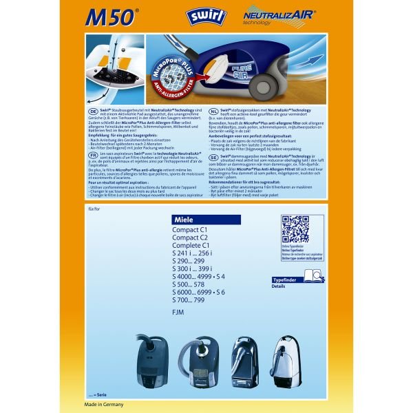 Swirl M50, Bolsa para el polvo, Universal, Blanco, Miele, S 290... 299 Serie, S 500... 599 Serie, Tango, Tango Plus, Complete C1 Serie, S 700... 799 Serie,..., Caja