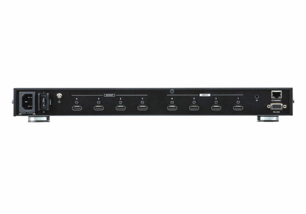El VM0404HB de ATEN es un switch de matriz HDMI 4K real que ofrece una manera sencilla y asequible de redireccionar cualquiera de las 4 fuentes de vídeo HDMI a alguna de las 4 pantallas HDMI. Con resoluciones de vídeo excelentes de hasta 4096 x 2160 a 60 Hz (4:4:4), el VM0404HB ofrece una redirección de señal sólida y conmutación de vídeo digital extremadamente rápida, lo que lo convierte en la solución perfecta para aplicaciones en las que es necesaria la redirección de señales digitales 4K real, tales como recintos para eventos, aulas digitales, auditorios, grandes almacenes y otros entornos.