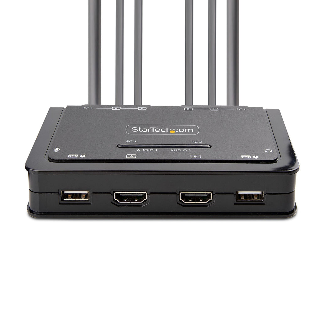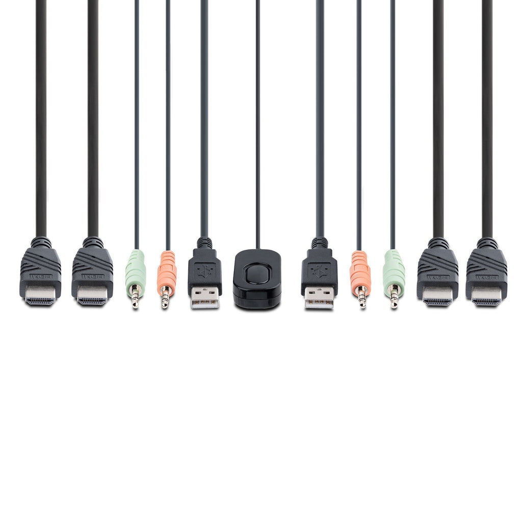 El conmutador KVM está alimentado por bus y cuenta con cables de entrada/salida de audio de 3,5 mm, USB-A y HDMI dual integrados. Esto garantiza la compatibilidad y el rendimiento entre el conmutador KVM, los monitores y los periféricos, sin necesidad de seleccionar y comprar los cables necesarios para esas conexiones.