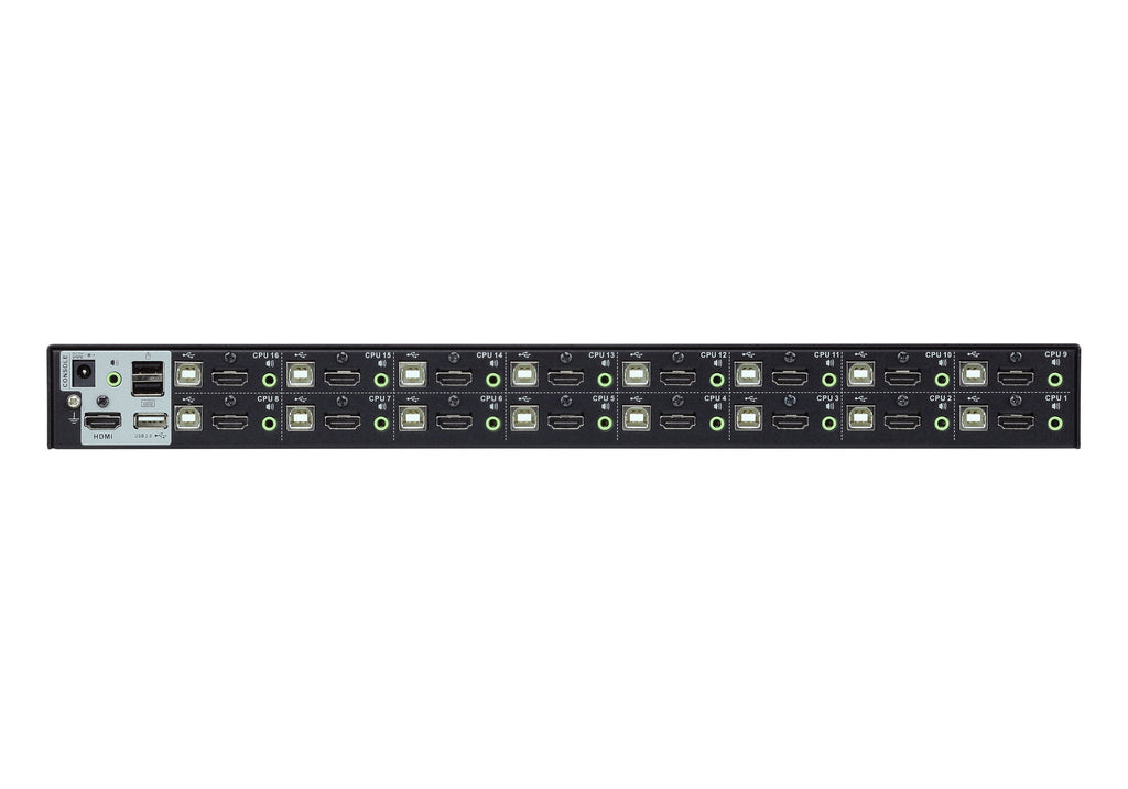 El conmutador KVM para consola USB de 16 puertos e interfaz HDMI CS17916 es una unidad multifuncional que permite acceder a y controlar 16 computadoras HDMI desde una consola con un teclado USB, mouse USB y monitor.