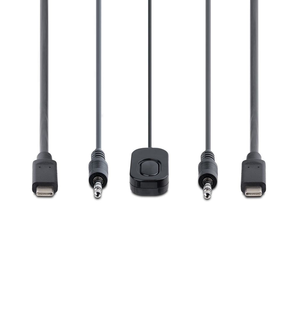 El conmutador KVM se alimenta por bus y cuenta con cables de entrada/salida de audio de 3,5 mm y USB-C integrados. Esto garantiza la compatibilidad y el rendimiento entre el conmutador KVM, el monitor y los periféricos, sin necesidad de seleccionar y comprar los cables necesarios para esas conexiones.