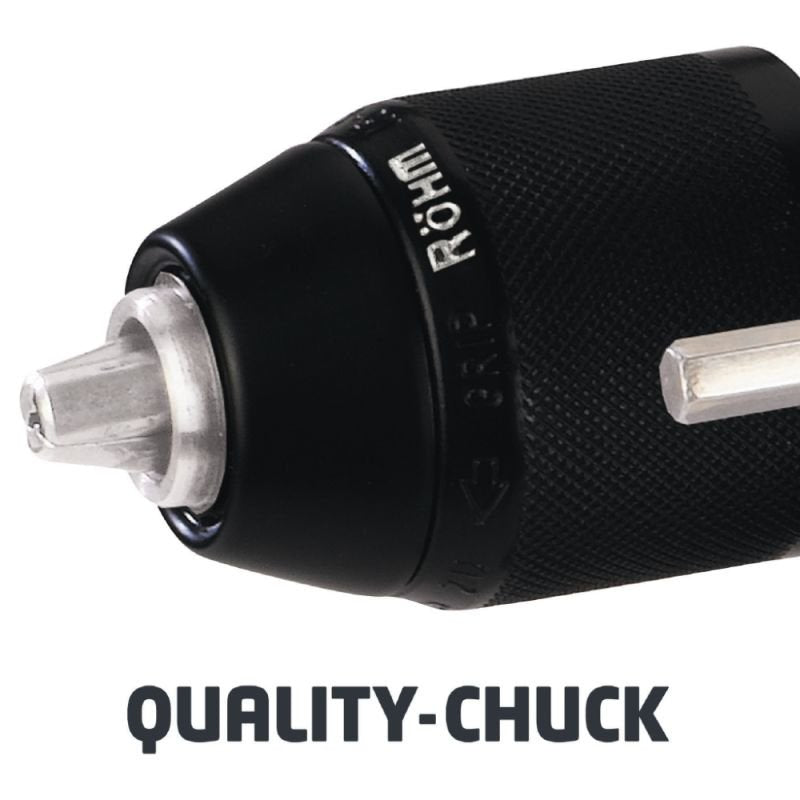 El taladro percutor RT-ID 65/1 es una herramienta compacta, de alta calidad y alto rendimiento que cumple con los requisitos de los expertos en atornillado, perforación y taladrado de percusión en la casa, el taller y el garaje. Su portabrocas de calidad con anillo de tope, función de bloqueo y el bloqueo del husillo con mecanismo de «pulsar y bloquear» permiten un cambio cómodo de la herramienta. La velocidad del RT-ID 65/1 se puede regular con precisión y preseleccionarse a través de la electrónica de control incorporada. Las profundidades de perforación exactamente repetibles están garantizadas por el tope metálico de profundidad de perforación ajustable y sólido. La rotación hacia la derecha y hacia la izquierda permite los trabajos de atornillado. Gracias a la empuñadura suave y al mango auxiliar con protección antitorsión, que también está equipado con empuñadura suave, la máquina puede guiarse de forma cómoda y segura. Un depósito de perforación en el mango auxiliar soporta brocas de varios tamaños siempre en la máquina. La pinza del cable logra el orden perfecto en un abrir y cerrar de ojos para la fijación del cable enrollado. En el práctico estuche de transporte y almacenamiento se puede guardar de manera ordenada y segura el RT-ID 65/1.