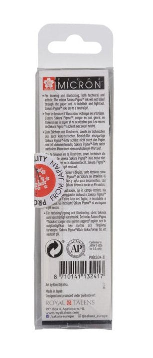 La tinta Pigma™ de Sakura no traspasa el papel, es permanente, resistente al agua, resistente a la luz, de secado rápido y de pH neutro. Los rotuladores puntafina Pigma Micron están disponibles en diversos colores.