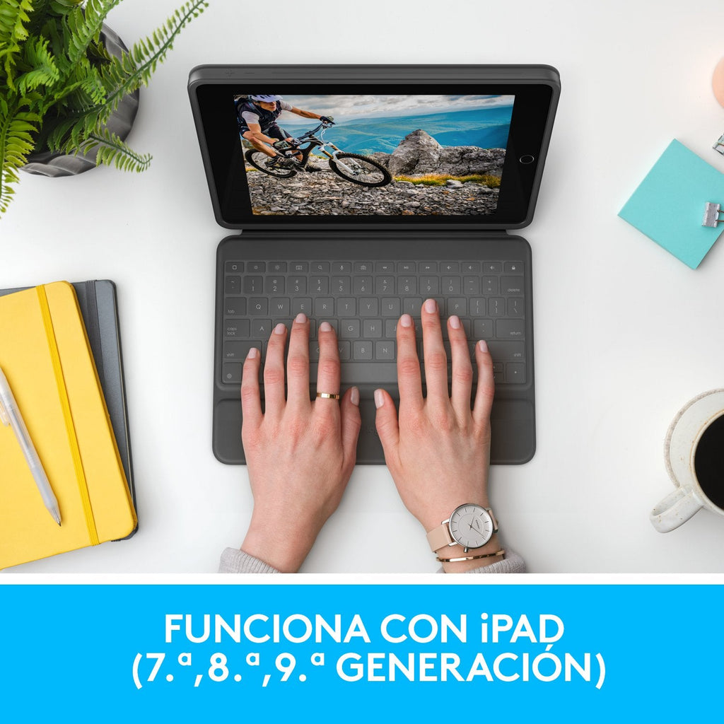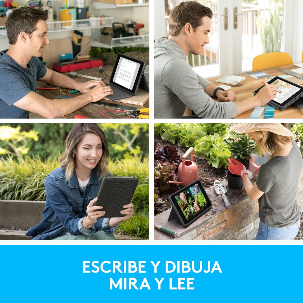 Protección reforzada. Diseño estilizado. ¿Crees que necesitas una funda voluminosa para proteger tu iPad (7.ª, 8.ª y 9.ª generación) de caídas, derrames y arañazos? Piénsalo bien. Rugged Folio es una funda con teclado para iPad sorprendentemente compacta y con protección anticaídas. Esta funda todo en uno ofrece cuatro modos de uso, un teclado a prueba de salpicaduras, teclas de accesos directos de iOS, etc.