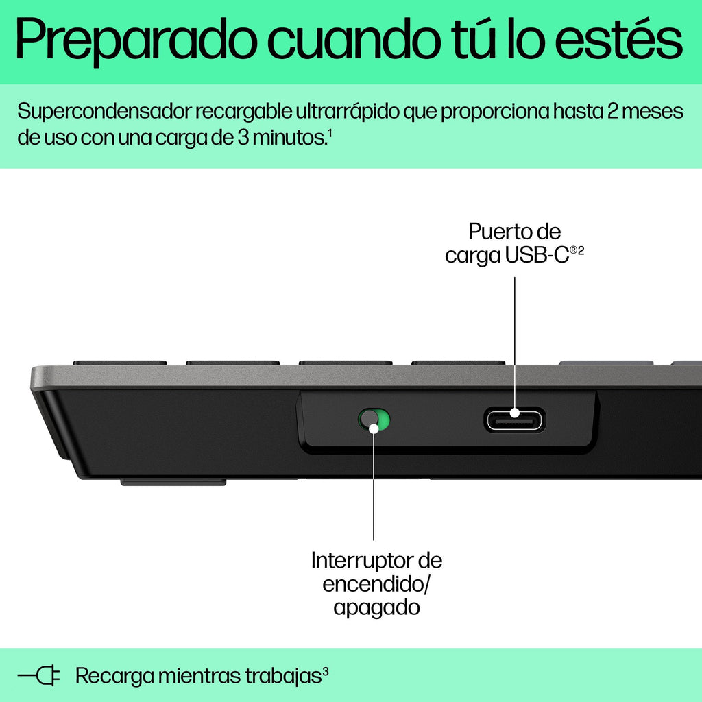 - Olvídate de la batería y trabaja sin preocupaciones con un supercondensador recargable ultrarrápido que proporciona hasta 2 meses de uso con una carga de 3 minutos[1]. Incluso puedes recargar el teclado mientras trabajas con el cable USB-C incluido[2] y seguir tecleando de forma ininterrumpida[3].