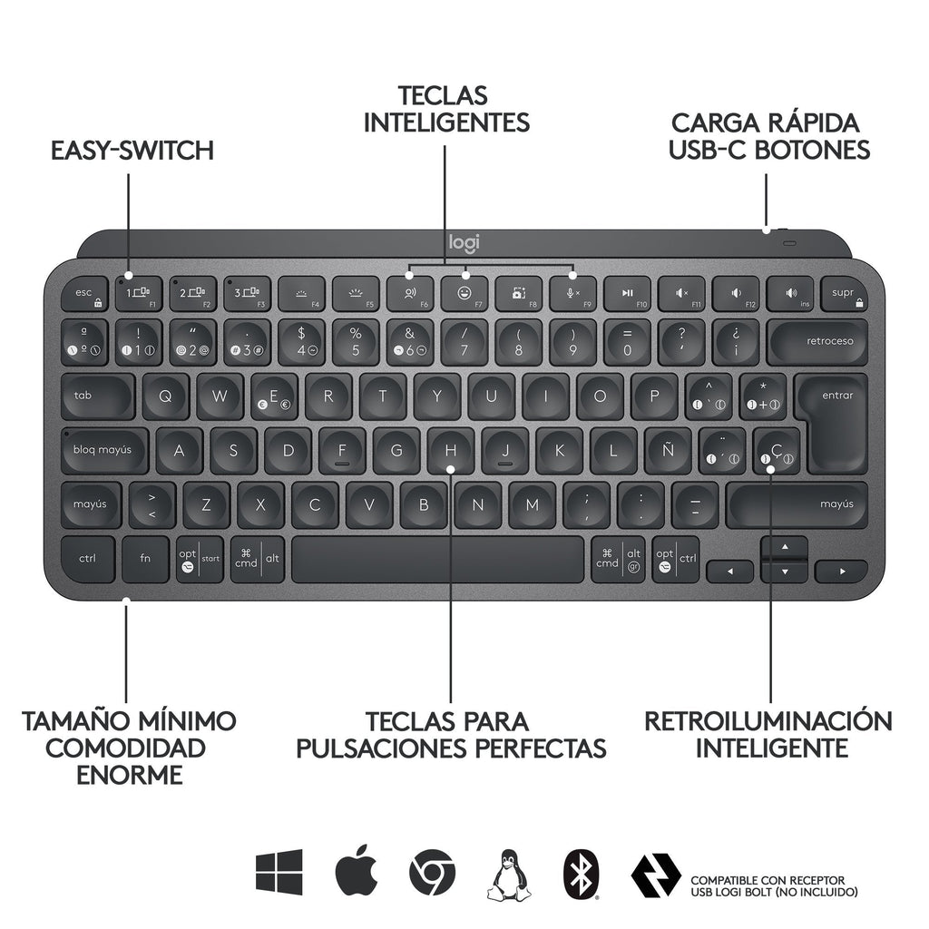 Logitech MX Keys Mini, Mini, Inalámbrico, RF Wireless + Bluetooth, QWERTY, LED, Grafito