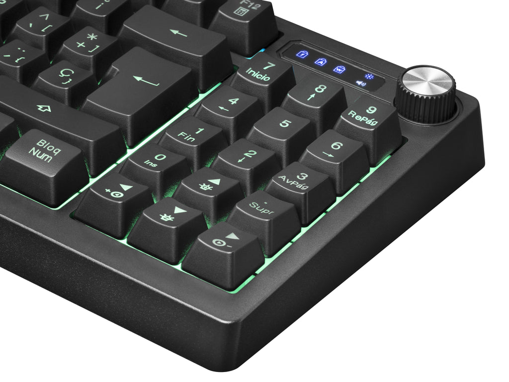 - ILUMINACIÓN FULL RGB: Con 12 efectos de iluminación diferentes controlables, podrás personalizar tu escritorio y potenciar su estética a tu gusto; Controla cómodamente el volumen e iluminación de tu teclado mediante la rueda de control situada en la parte superior derecha de tu teclado