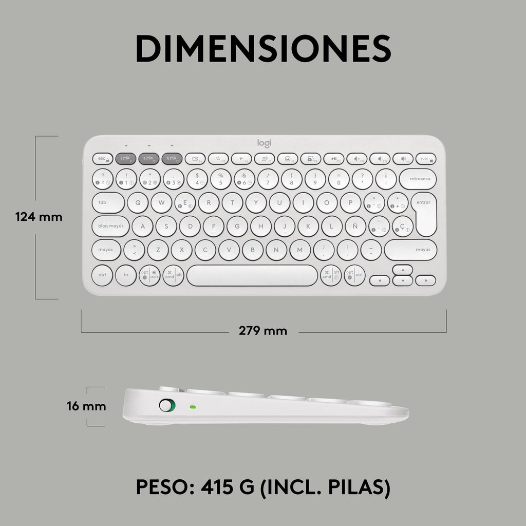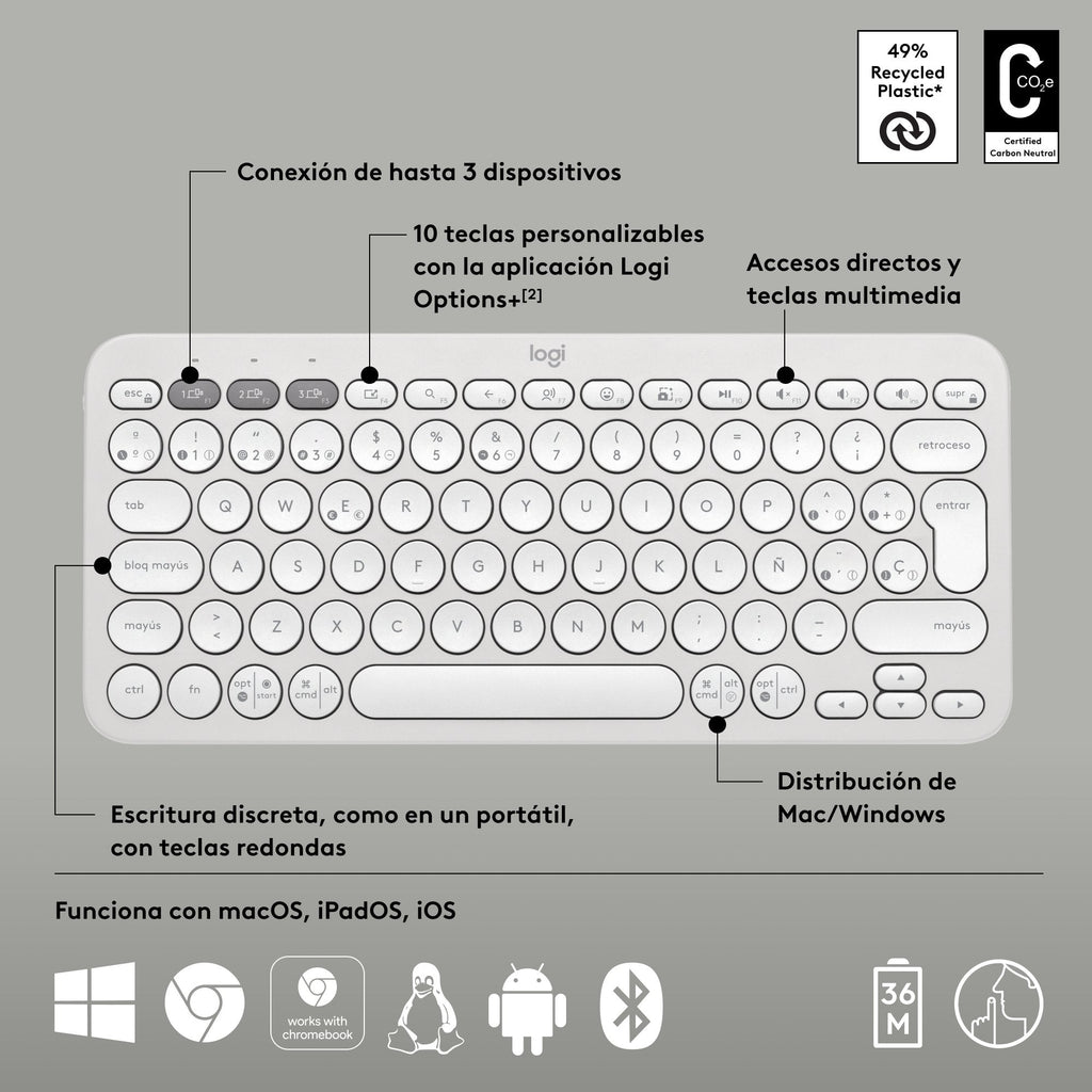 - Alterna fácilmente entre 3 dispositivos: Usa Bluetooth para conectar hasta 3 dispositivos inalámbricos con diversos sistemas operativos (Windows, macOS, iPadOS, ChromeOS) y alternar entre ellos con un clic de los botones Easy-Switch