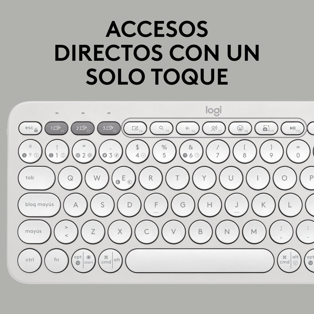 - Ahorro de tiempo: Obtén acceso instantáneo a la búsqueda, la captura de pantalla, el menú de emojis y más con las teclas de accesos directos Fn; personaliza las 10 teclas Fn con la aplicación Logi Options+ para que puedas hacer las cosas a tu manera