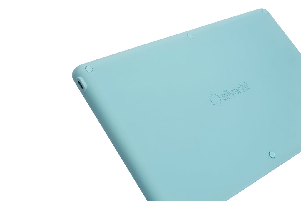 - Conector lateral microUSB para carga. Base en goma antideslizante en color Azul turquesa