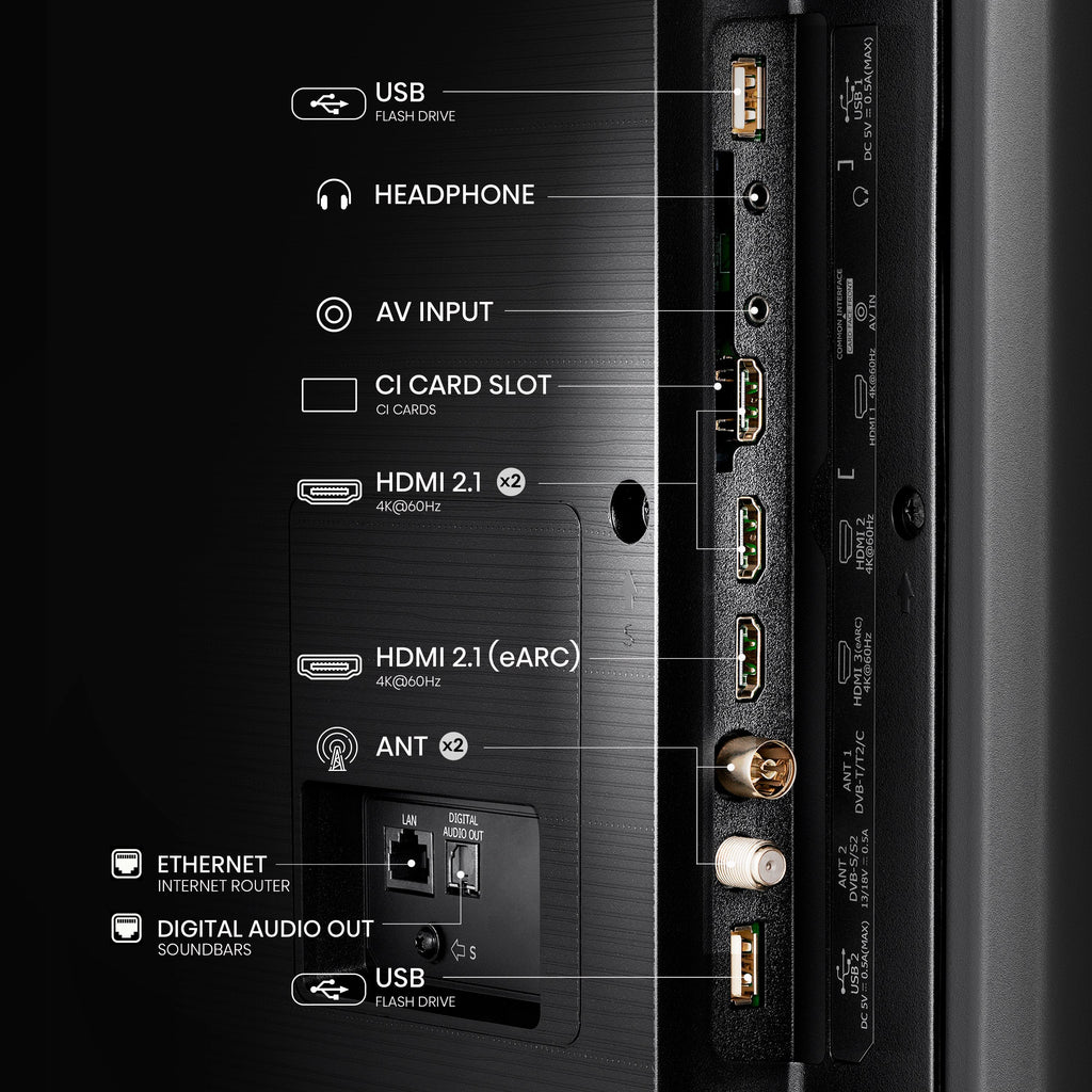 - Prestaciones de juego: Modo automático de baja latencia (ALLMˌ Auto Low Latency Mode), Barra de juego, Frecuencia de actualización variable (VRRˌ Variable Refresh Rate)