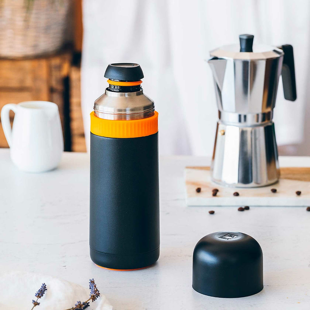 En la base dispone de una alfombrilla antideslizante de silicona para una mayor estabilidad y confort, que evita que el termo resbale al manejarlo. Su anillo de silicona permite sujetarlo con seguridad al abrirlo y cerrarlo. Cuenta con tapón exterior de rosca y tapón interior de seguridad anticaída con función «stop», también de rosca, que proporciona un cierre hermético y que permite beber sin necesidad de extraer el tapón por completo.