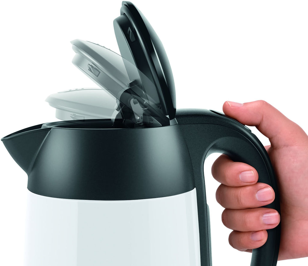 Bosch TWK3P421, 1,7 L, 2400 W, Negro, Blanco, Acero inoxidable, Indicador de nivel de agua, Protección contra sobrecalentamiento