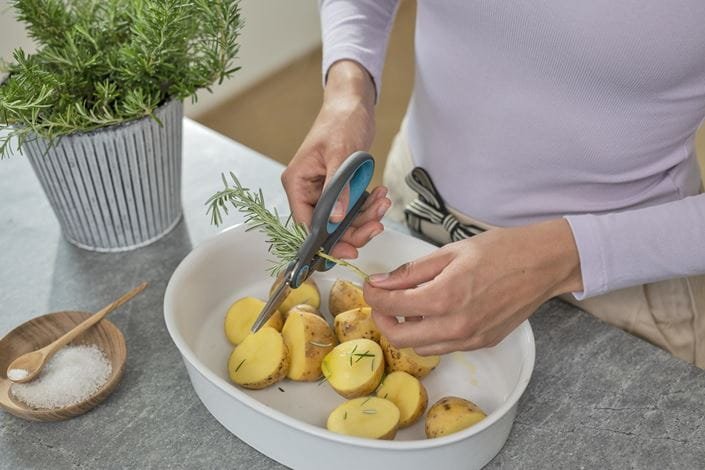 Corta de manera confiable hierbas leñosas. Las cuchillas puntiagudas hechas de acero duradero y de acero inoxidable le permiten cortar con precisión duradera. Un detalle inteligente de las tijeras son los tres agujeros de tamaño diferente entre los dos mangos, simplemente tire del tallo a través del orificio para eliminar fácilmente las hojas. De esta manera, has defoliado el tallo de la hierba en un solo movimiento. Ahora puede usar las hojas de romero inmediatamente para cocinar o ponerlas para que se sequen. Los mangos de las hierbas están hechas con sostenibilidad en mente. Están hechos de más del 70 % de plástico reciclado, lo que ahorra recursos valiosos. Gracias a los mangos ergonómicos de Ergotec, las tijeras de hierbas encajan cómodamente en su mano. Los mangos que no son de deslizamiento tienen agarres suaves y son igualmente fáciles de usar para la derecha o de los zurdos. Las cuchillas son adecuadas para el contacto con los alimentos y las tijeras seguras de alimentos no se aferran a los aromas o sabores. Son un lavavajillas seguro para una fácil limpieza. Herbcut es un producto de calidad, hecho en Alemania y Gardena, le ofrece una larga garantía del fabricante de 25 años después del registro en Gardena.com/registration dentro de los 3 meses posteriores a la compra. Tratar con cuidado. Gardena microcorte. Dale a tu cosecha el respeto que merece con nuestra gama de herramientas precisas.