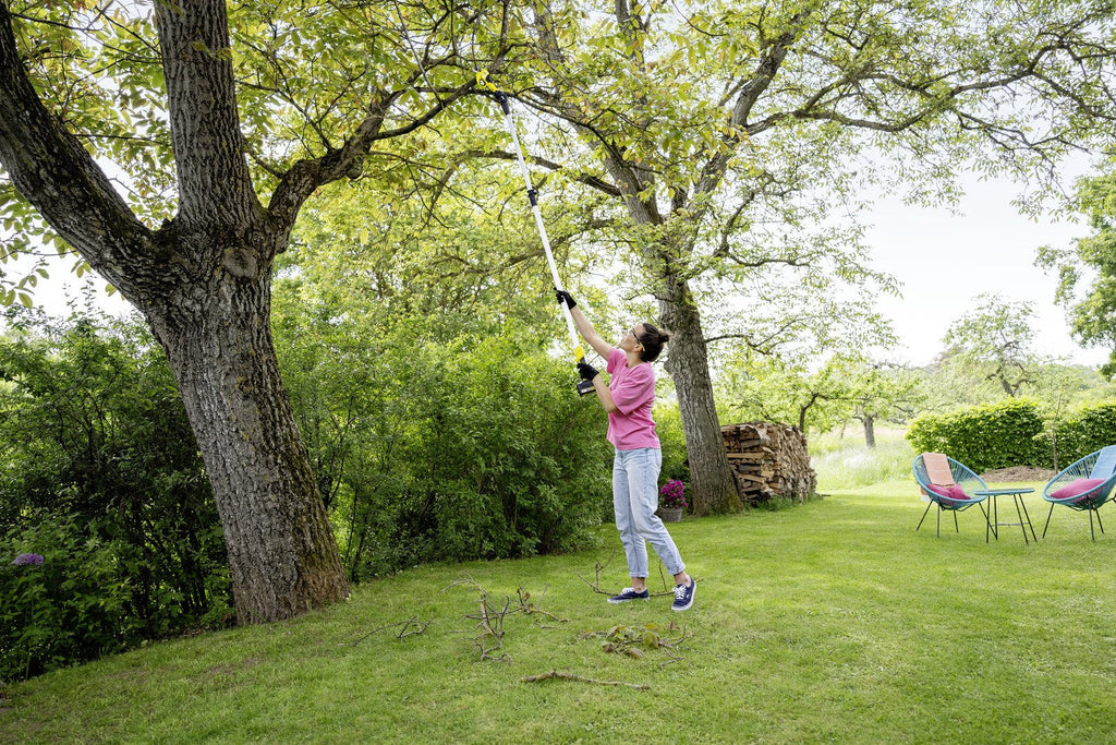 Poda de árboles sencilla gracias a la potencia de la batería: las ramas con un diámetro de hasta 2,5 centímetros no presentan ninguna dificultad para la podadora a batería de Kärcher. Gracias a su potente cuchilla bypass, el corte es especialmente preciso y no requiere esfuerzo. La poda suave también favorece el crecimiento sano de las plantas. Esto facilita y hace más segura la tala y poda de árboles y también la poda de plantas leñosas. Cómodo trabajo por encima de la cabeza: con la extensión telescópica opcional (no incluida en el equipo de serie), trabajar a una altura de hasta 3,5 metros también resulta fácil y cómodo.