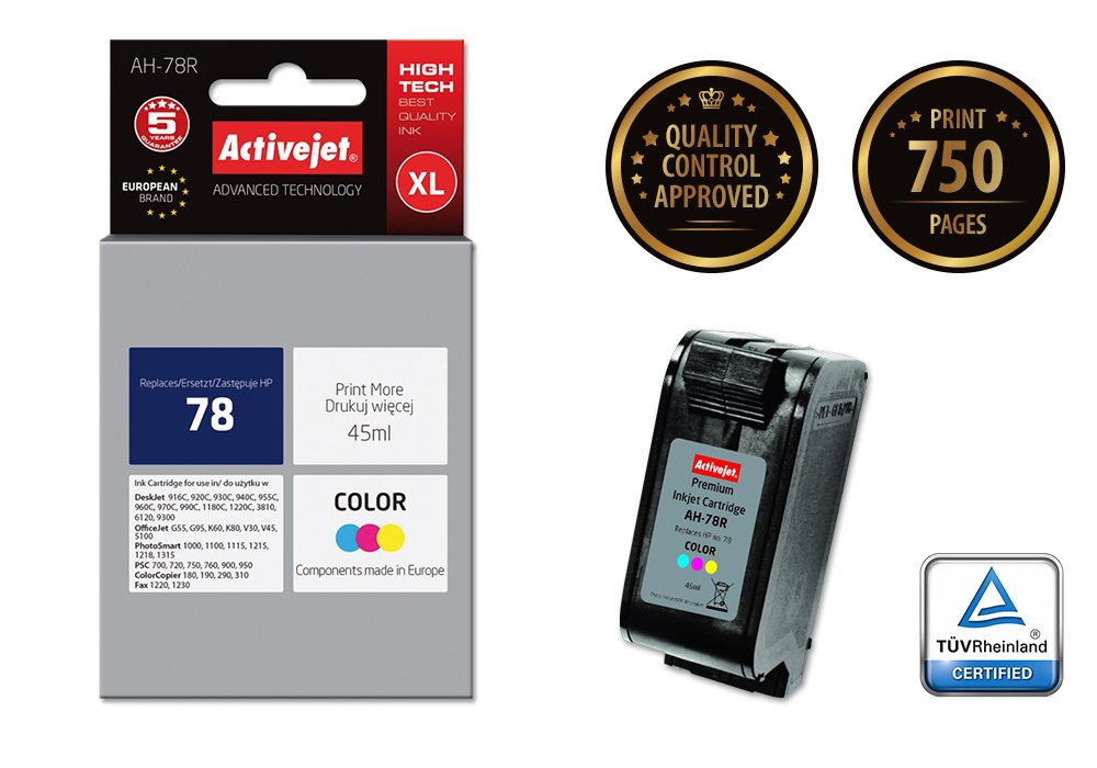 Activejet Tinta AH-78R (repuesto HP 78 C6578D; Premium; 45 ml; color), Alto rendimiento (XL), Cian, Magenta, Amarillo, Tinta a base de colorante, 45 ml, 1 pieza(s), Pack individual