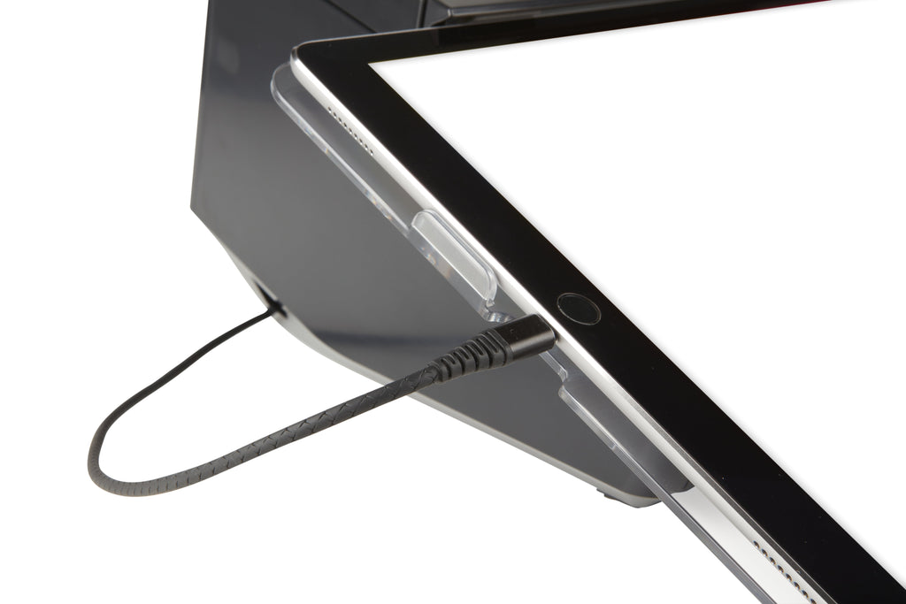 Su diseño es discreto y dispone de una sujeción deslizante que permite fijar prácticamente cualquier dispositivo de tableta de forma segura. También puede instalarse tanto horizontal como verticalmente, permitiendo mayor flexibilidad a la hora de organizar el espacio. E incluso dispone de una opción de montaje en pared.