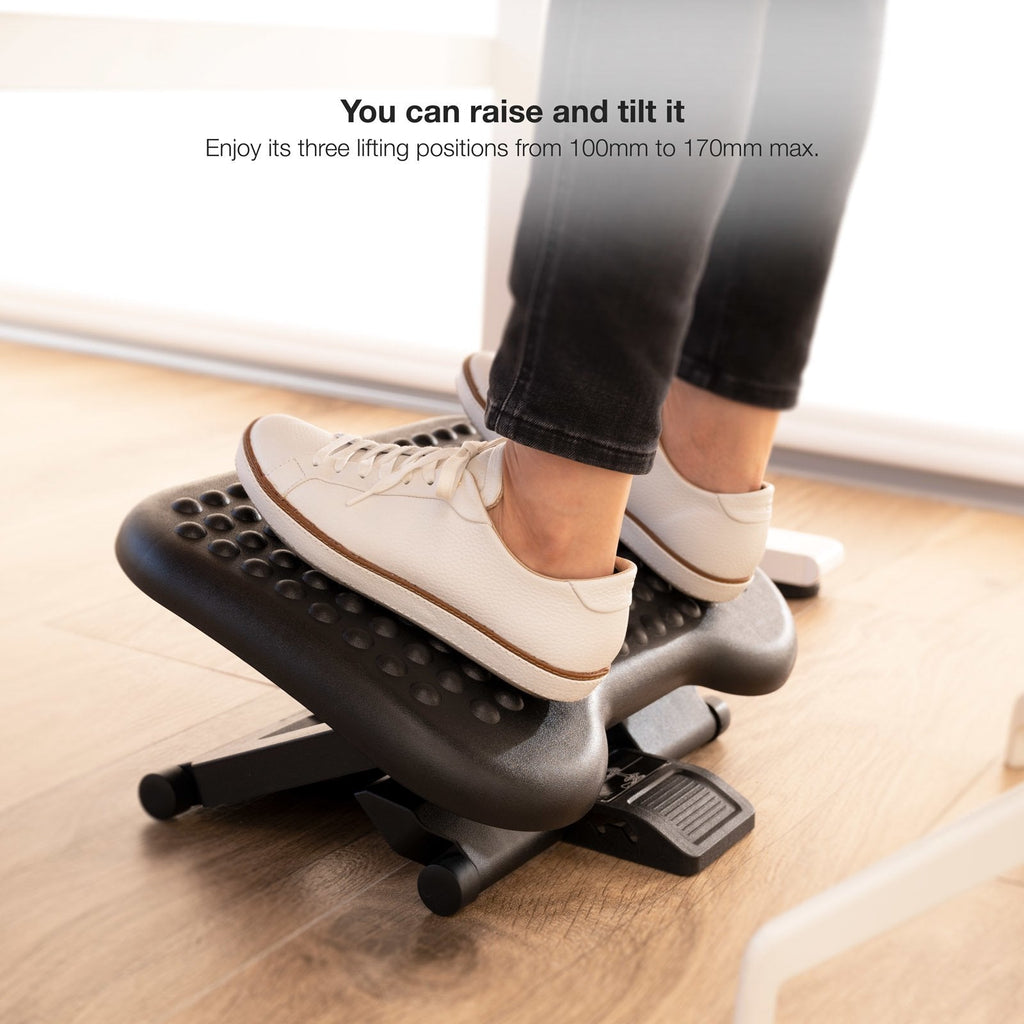 Trabaja cómodamente desde casa o en tu oficina. Nuestro reposapiés te ayudará a mantener tu higiene postural y a conseguir el mayor confort mientras realizas tus tareas diarias. Es completamente plegable y lo podrás regular a tu gusto. Disponible en color negro.