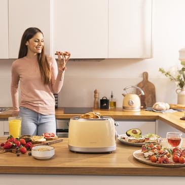 La tostadora cuenta con un un diseño de acero inoxidable lacado en amarillo con detalles en cromado, perfecto para combinar en tu cocina y darle un toque de estilo.