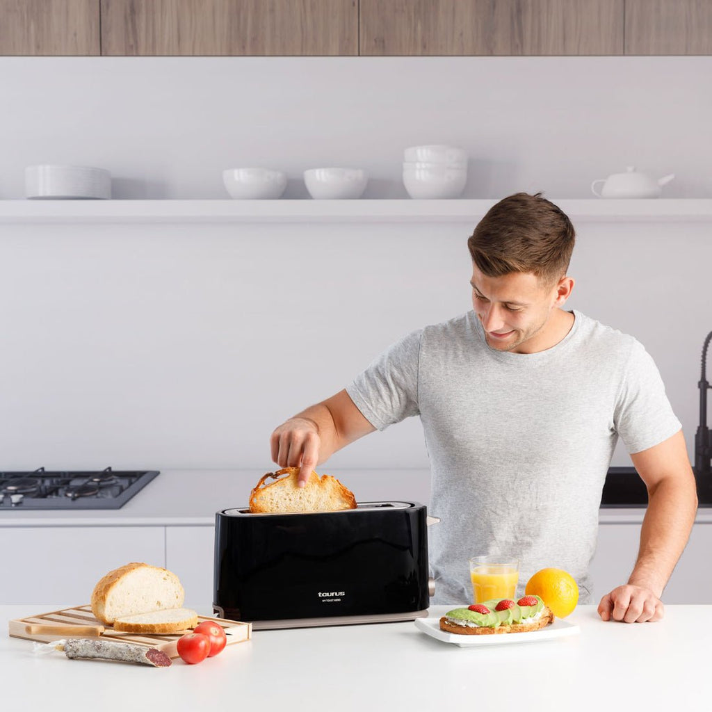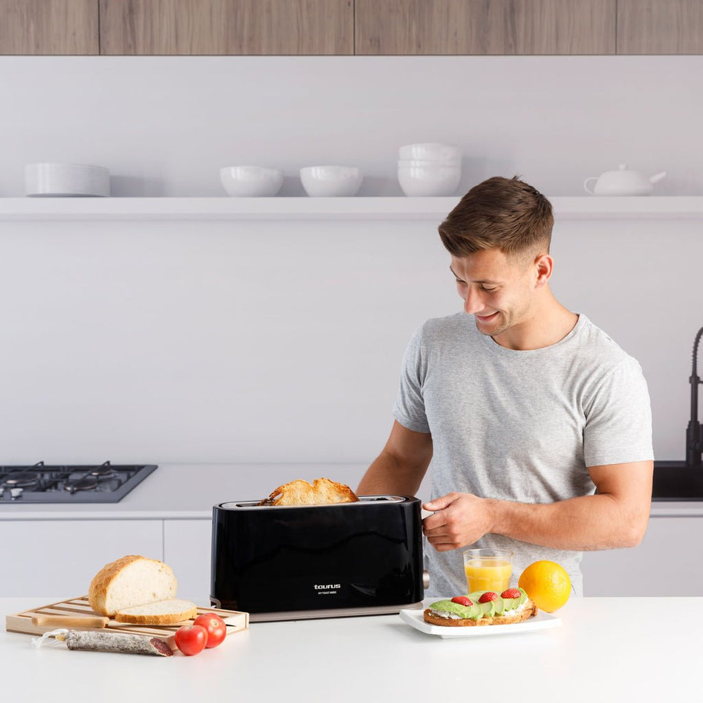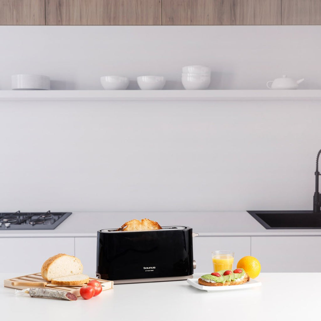 La tostadora Taurus Mytoast Nero está diseñada en negro y fabricada en un plástico ligero y fácil de limpiar. Cuenta con un diseño elegante que combina prácticamente con cualquier cocina y que le proporciona un toque distinguido.
