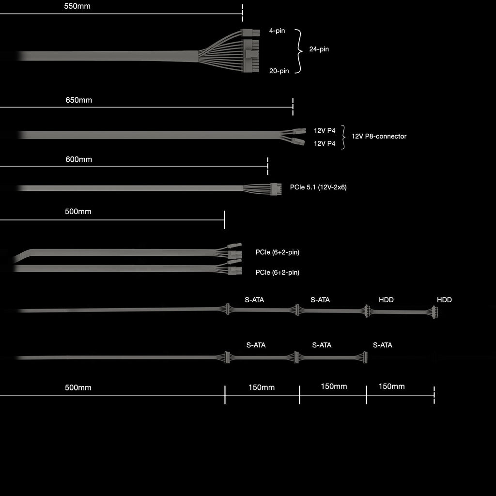 - Longitud del cable de alimentación SATA: 500,650,800 mm
