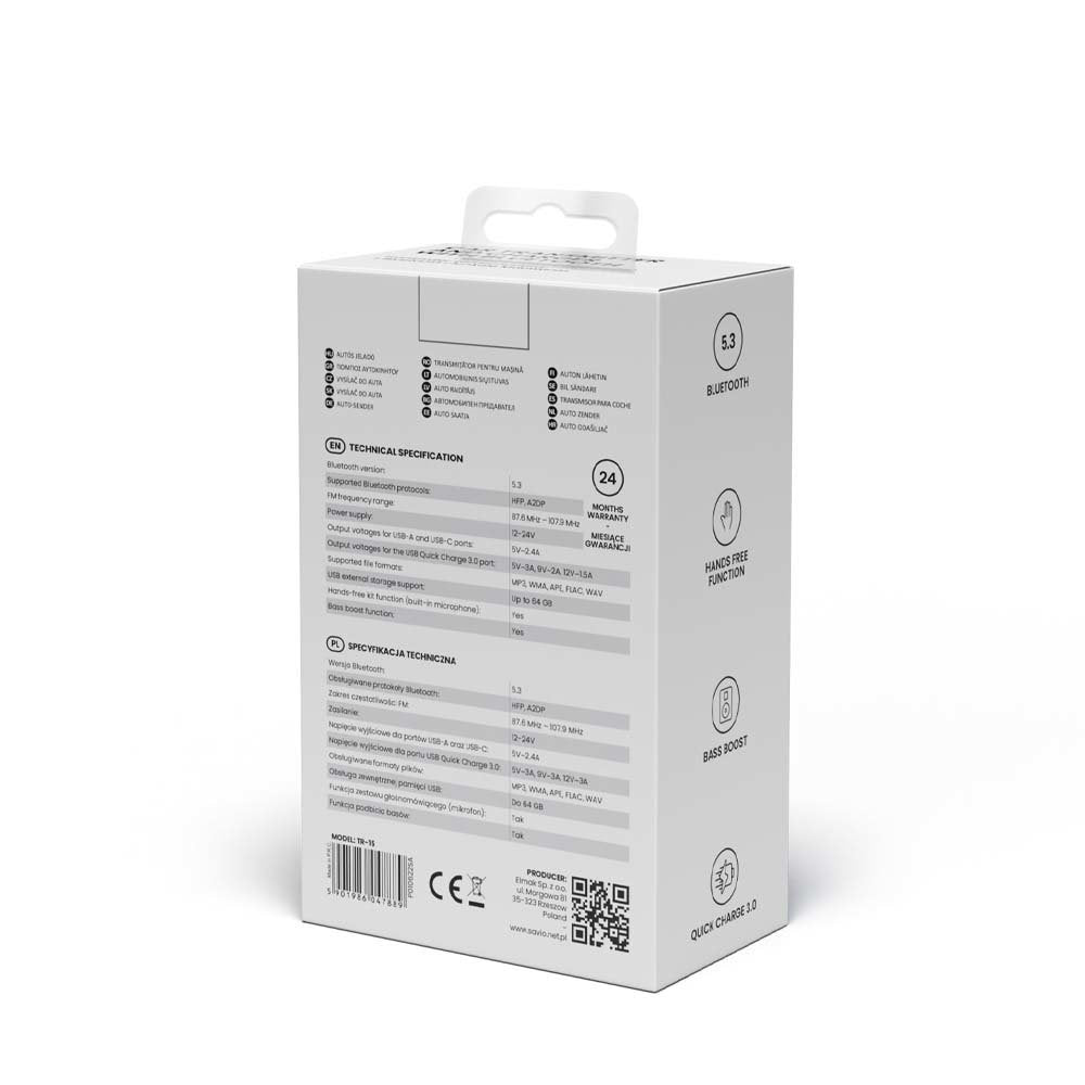 El transmisor de coche TR-15 es un dispositivo multifuncional equipado con Bluetooth 5.3. Su procesador incorporado permite reproducir música de forma inalámbrica, mientras que la combinación de la función de manos libres con un micrófono de alta calidad garantiza la mejor experiencia durante las llamadas. La tecnología Quick Charge 3.0 permite cargar rápidamente tu smartphone u otro dispositivo. El transmisor también cuenta con una pantalla LED y una función adicional de refuerzo de bajos –Bass Boost– que mejora significativamente la calidad y el sonido de las pistas reproducidas. Un puerto USB adicional permite conectar fácilmente una fuente externa con archivos de audio.