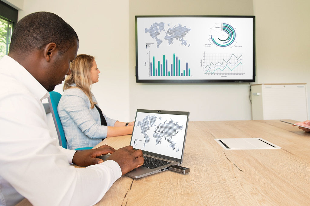 Con el sistema de presentación inalámbrico, puedes transmitir señales de vídeo y audio HDMI® en Full HD a una distancia de hasta 50 m con una línea de visión directa. La puesta en marcha y el funcionamiento son muy sencillos. Plug & Play: simplemente conéctese y empiece. El conjunto puede ampliarse hasta 16 unidades receptoras (DS-55320). Cambie al transmisor deseado de forma rápida y sencilla con sólo pulsar un botón y comparta sus contenidos. También puedes compartir contenidos directamente desde tu dispositivo móvil (smartphone/tableta) a través del sistema operativo del dispositivo móvil sin necesidad de una aplicación adicional. El transmisor se puede alimentar a través del puerto HDMI de su PC (se necesitan más de 500 mA). Para un funcionamiento seguro y estable, recomendamos alimentar siempre el emisor y el receptor a través del cable micro USB. Gracias al diseño compacto del transmisor y el receptor, la instalación es fácil, rápida y personalizable: la solución perfecta para las salas de reuniones y conferencias