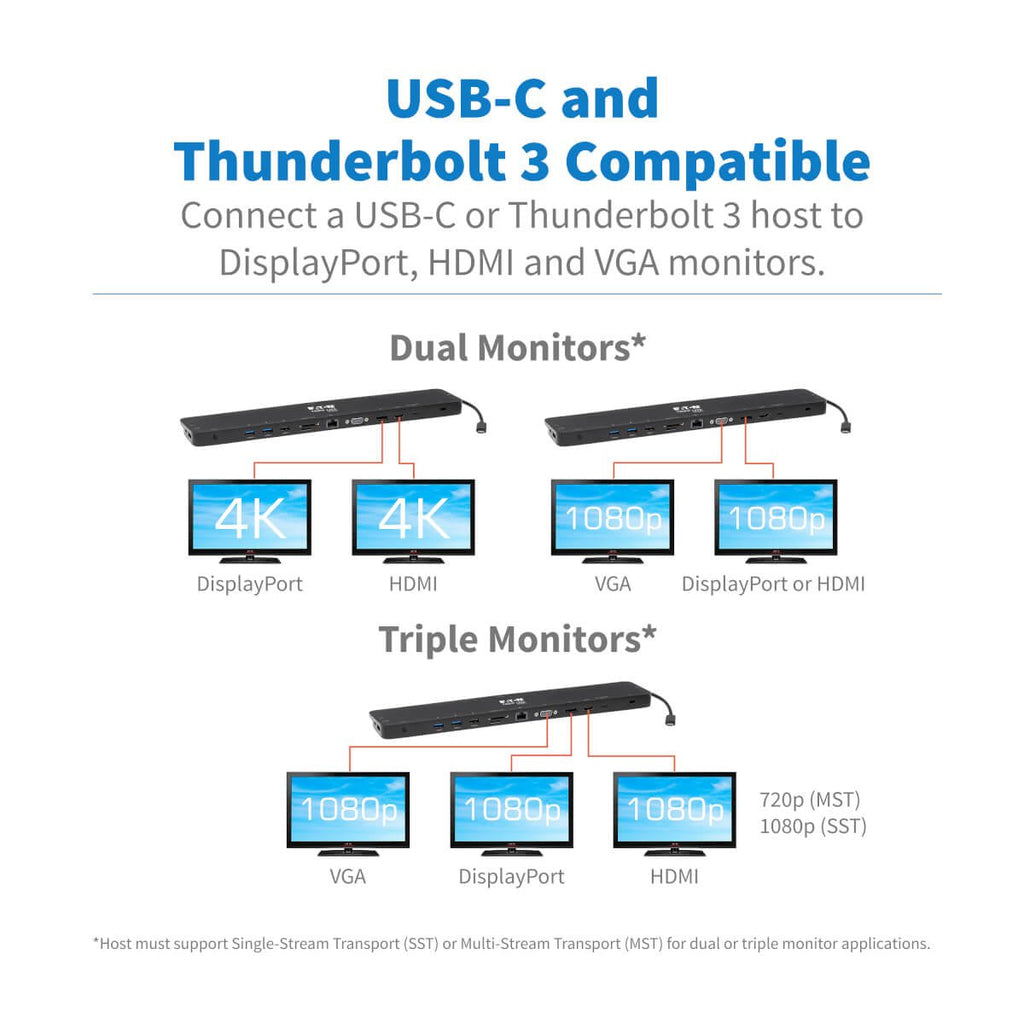 Al conectar el cable USB C desprendible a una fuente que soporte modo DisplayPort Single Stream Transport [SST] o Multi Stream Transport [MST], puede conectar hasta tres pantallas simultáneamente. Esto le permite mostrar la misma imagen en todos los monitores, extender su computadora anfitrión a través de todos con diferentes ventanas abiertas en cada una o combinar todo en una pantalla grande como un muro de video. Conecte múltiples monitores en Modo Extendido (4K @ 30 Hz HDMI y 4K @ 30 Hz DP; 1080p HDMI y 1080p VGA; 1080p DP y 1080p VGA; o 720p HDMI, 720p DP y 720p VGA) y en Modo Espejo (4K @ 30 Hz HDMI y 4K @ 30 Hz DP; 1080p HDMI y 1080p VGA; 1080p DP y 1080p VGA; o 1080p HDMI, 1080p DP y 1080p VGA). Nota: Las laptops o computadoras con OS de Mac solo se extienden a un monitor. Los otros se reproducirán en Modo Espejo.