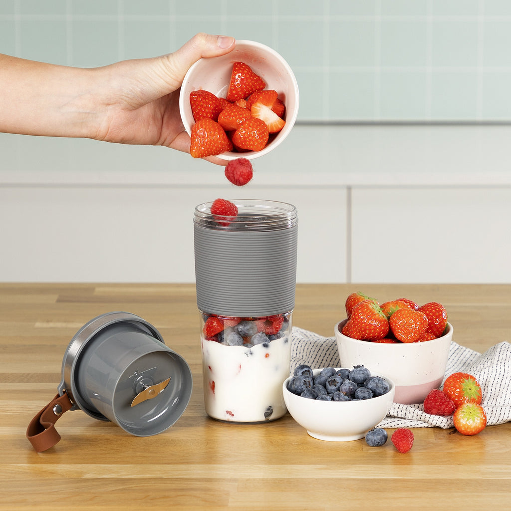 La minibatidora está hecha de Tritan® de alta calidad sin BPA y está equipada con 2 cuchillas de acero inoxidable. La batería de litio tiene una capacidad de 1600 mAh y una potencia de 50 W. Esto hace que sea muy fácil licuar diferentes frutas y verduras.