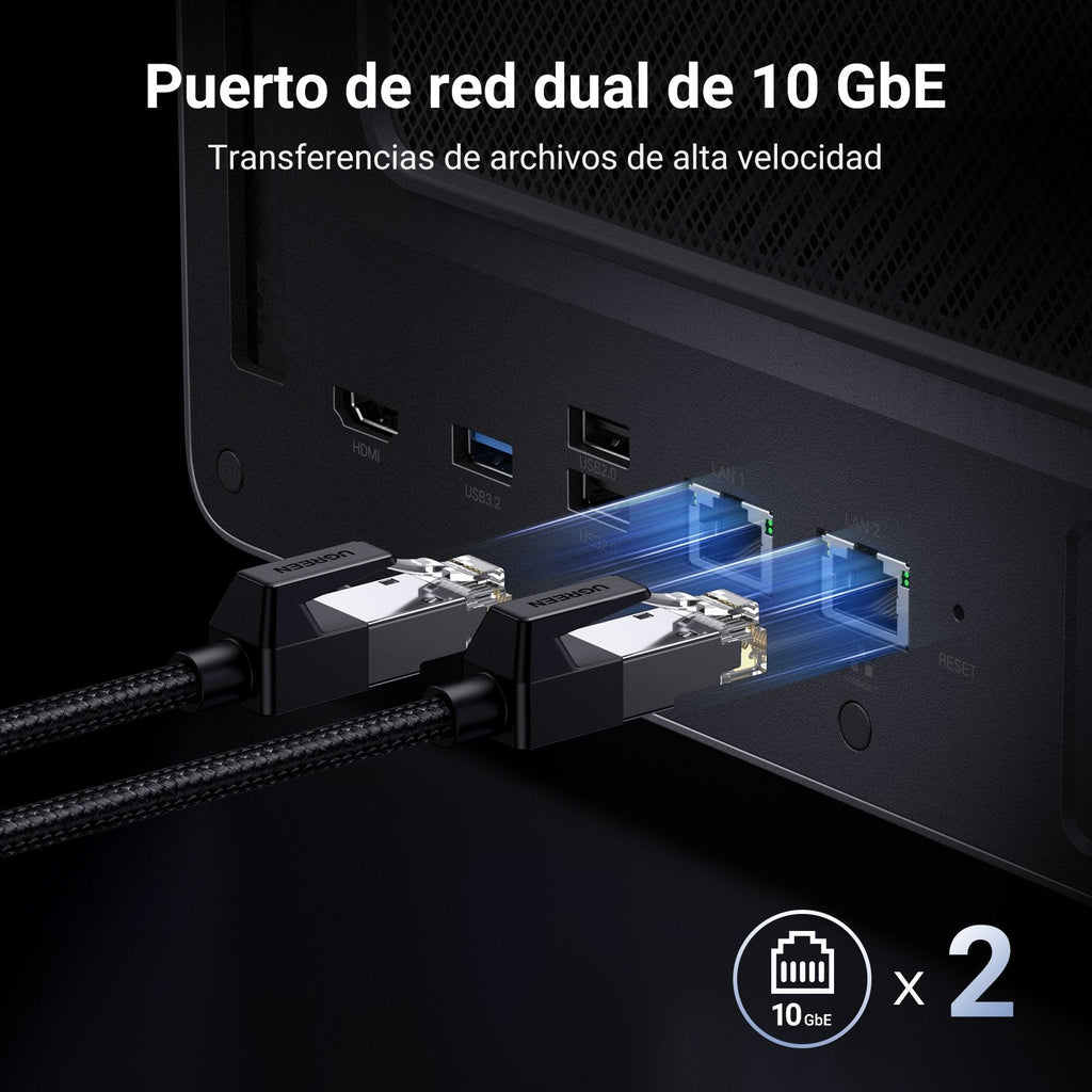 - Puertos de red duales de 10 GbE: Dos puertos de red de alta velocidad de 10 GbE que se pueden combinar para alcanzar un ancho de banda de 20 G para velocidades de descarga de hasta 2500 MB/s. Transfiera archivos grandes con la mayor fluidez posible. La carga entre los dos enlaces de puerto se puede ajustar y equilibrar dinámicamente para mejorar la eficiencia de la transmisión