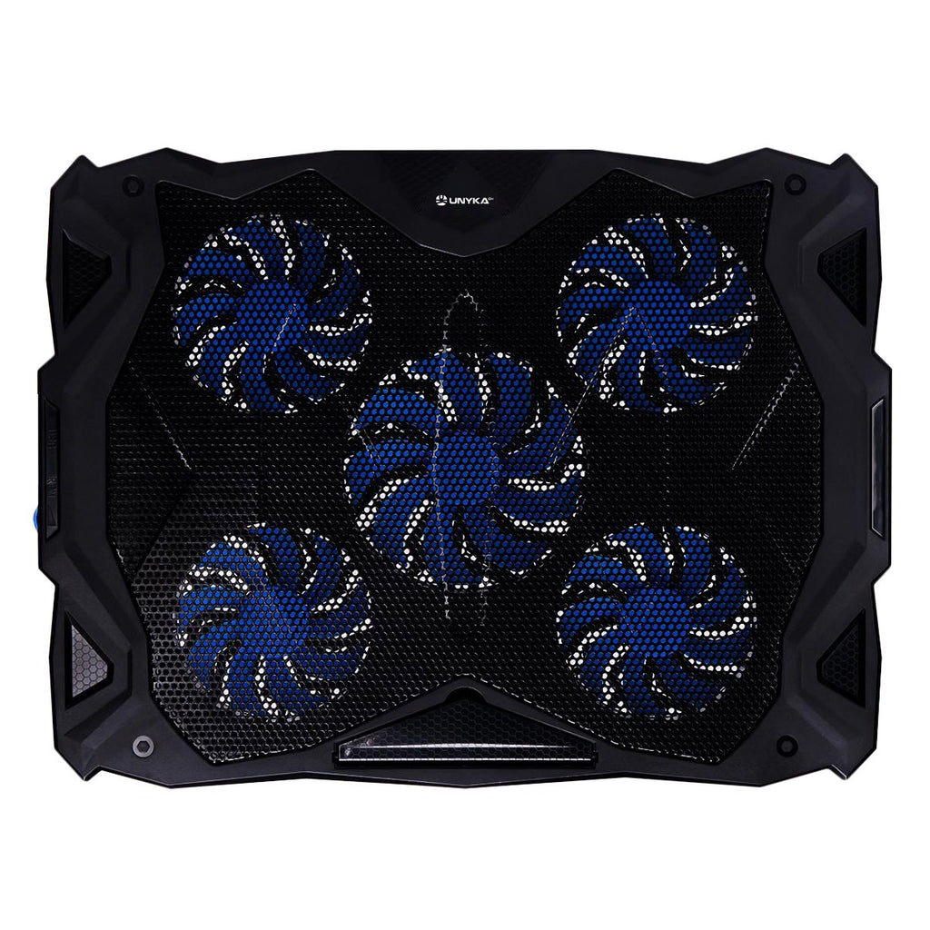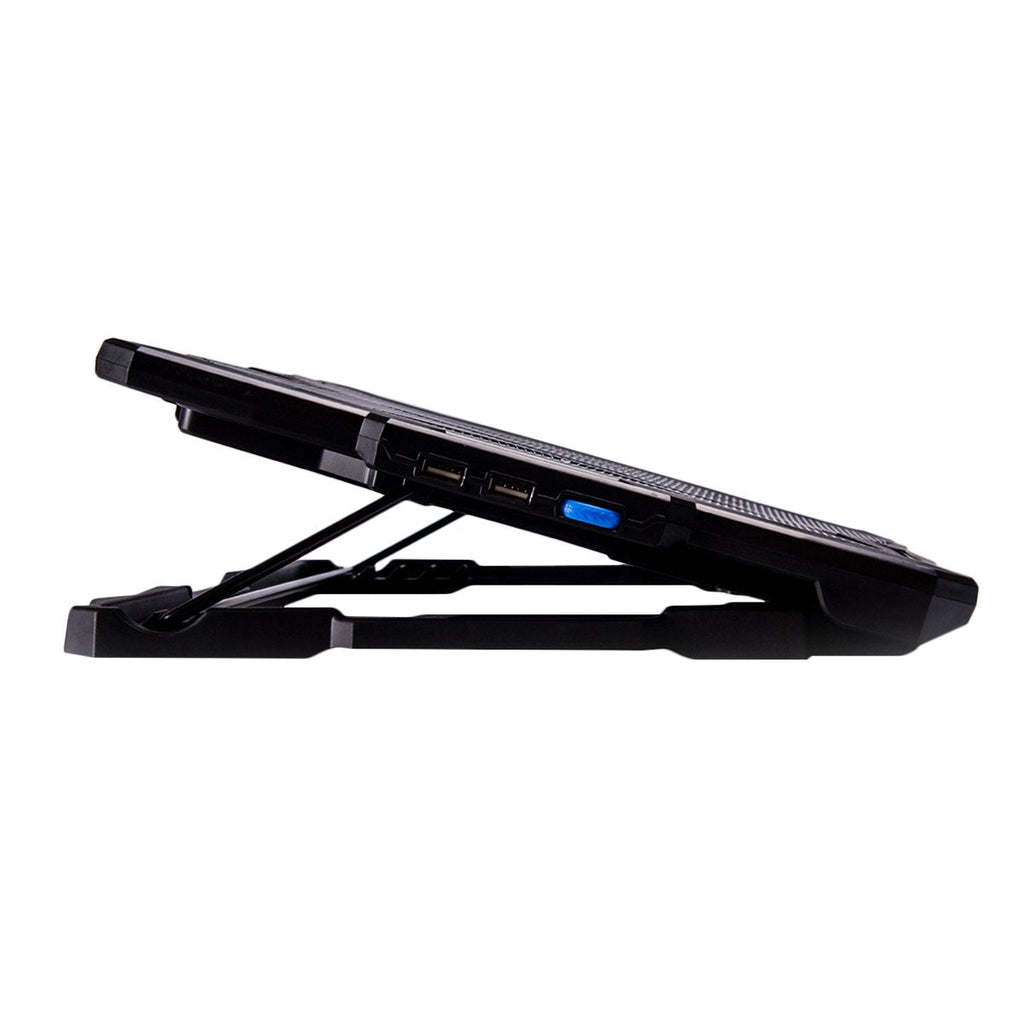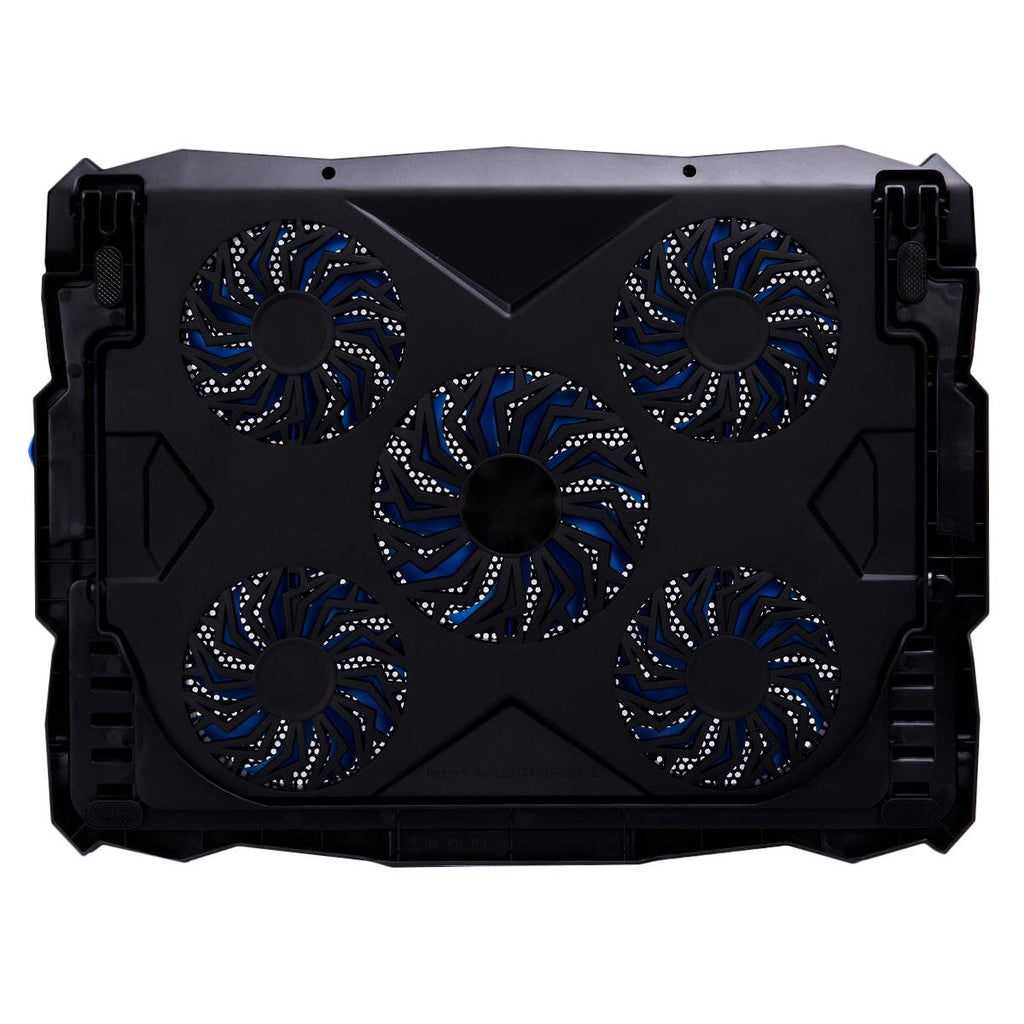 Base de refrigeración para portátiles de hasta 19" equipada con cinco ventiladores LED azules. Diseño optimizado con pies plegables para elevar la superficie y 2 puertos USB.
