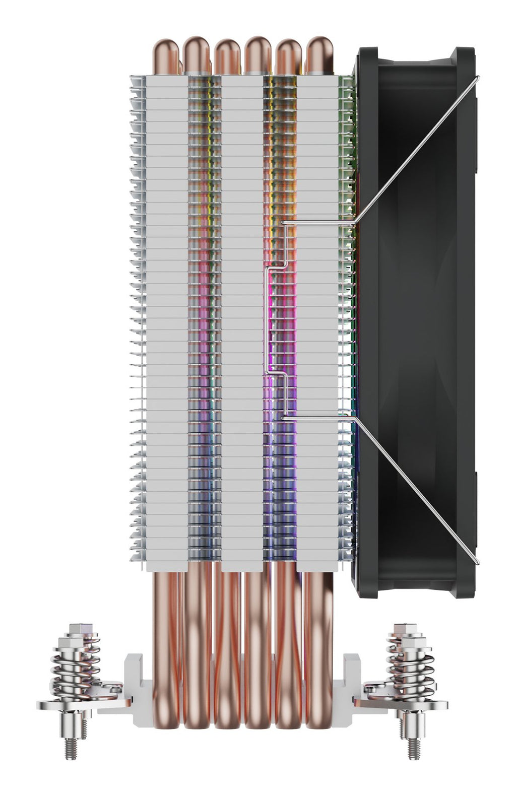 Este modelo incluye un bloque disipador de aluminio extrusionado con aletas de alta densidad para maximizar el flujo de aire. Incorpora un ventilador PWM con sensor térmico de 120 mm que alcanza hasta 1600 r.p.m., proporcionando un equilibrio óptimo entre rendimiento y silencio. Gracias a sus 6 heatpipes de cobre, permite una transferencia de calor eficiente y soporta CPUs con un TDP de hasta 180W.