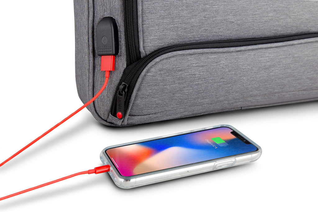 MIXEE EDITION tiene un compartimento específico para un ordenador portátil de hasta 14.1'', con una correa de sujeción y un compartimento para tableta de hasta 10,5''. También hay sitio para accesorios y documentos, gracias a su compartimento delantero con organizador. Este maletín tiene la opción de cargar un smartphone o una tableta, con el puerto USB que lleva integrado en el lateral .