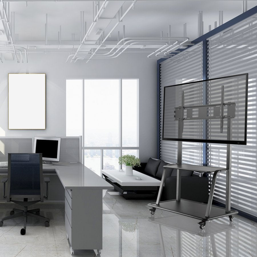 El soporte de suelo TVCART3 de V7 está fabricado para el transporte ultrarresistente de pantallas e IFP de gran formato. Es compatible con pantallas de hasta 105 pulgadas en diagonal y facilita el transporte por el campus o la oficina. Presenta una base con ruedas ancha que le da estabilidad adicional y ruedas de bloqueo resistentes que le confieren movilidad y seguridad. Además, tiene dos estantes de apoyo integrados para equipos y accesorios audiovisuales, y cuenta con el respaldo de la garantía de V7.