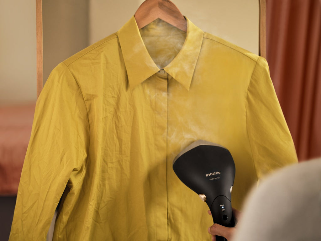 La serie 7000 tiene un diseño compacto que la convierte en la solución perfecta para vaporizar tus prendas en cualquier momento y lugar sin necesidad de una tabla de planchar.