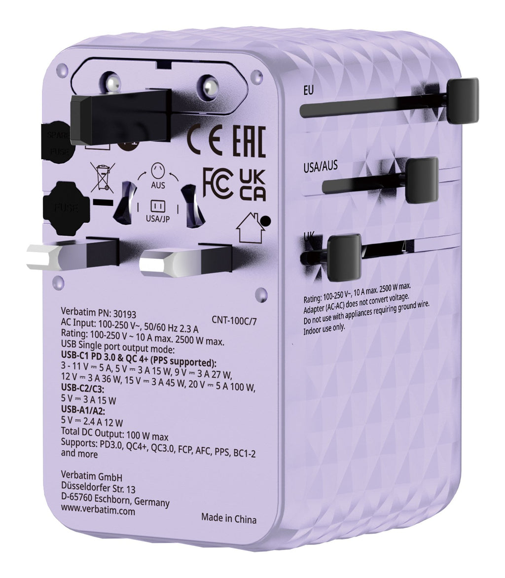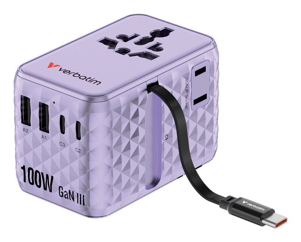 Verbatim Charge 'N' Travel 100w Universal Travel Adapter With Retractable Cable Purple