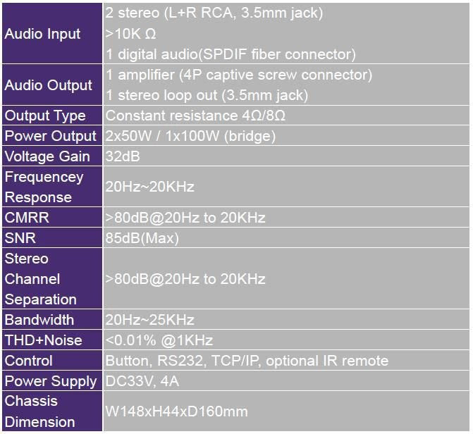 - Potencia de salida en modo puente por canal (8 ohmios): 100 W