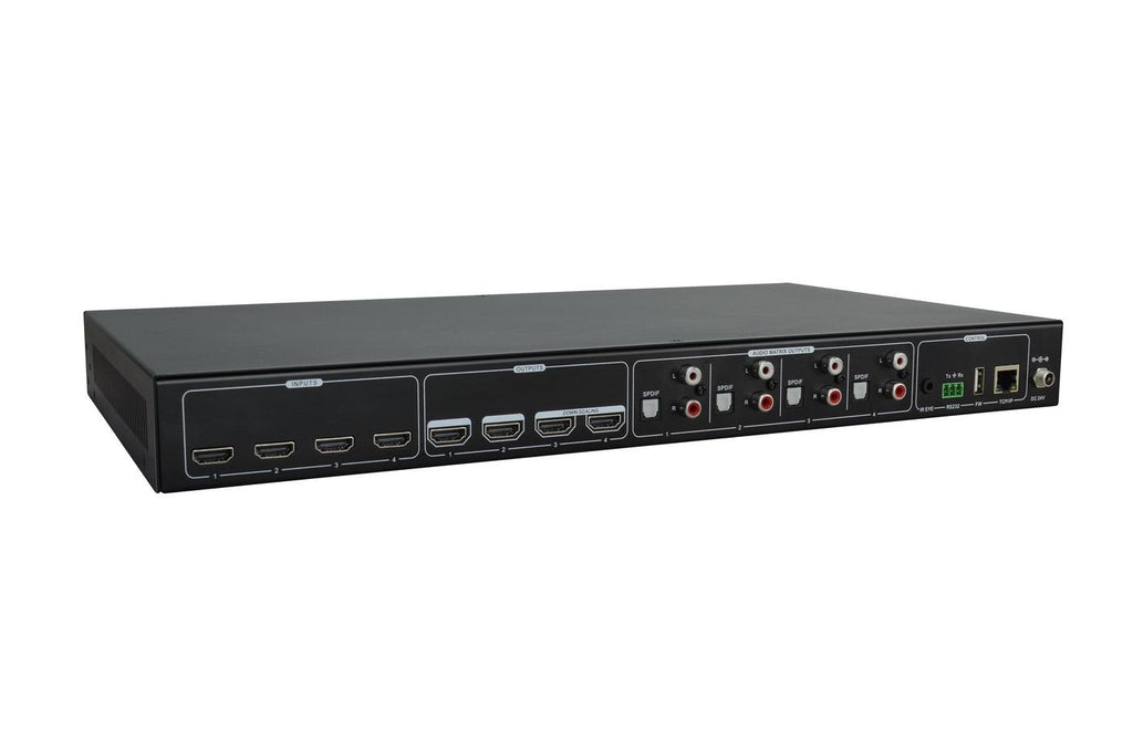 - Cantidad de puertos de entrada HDMI: 4 Cantidad de puertos de salida HDMI: 4 Puertos de entrada RJ-45: 1 Enchufe de entrada de CC