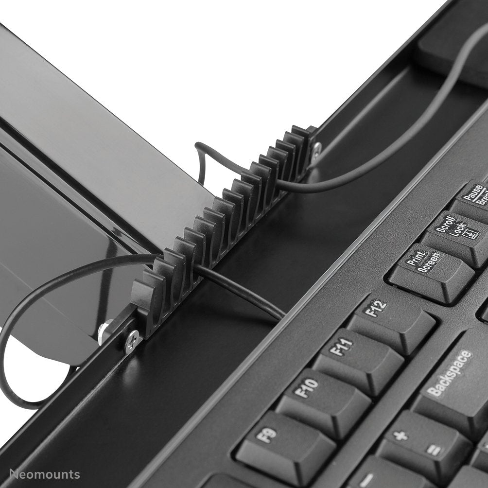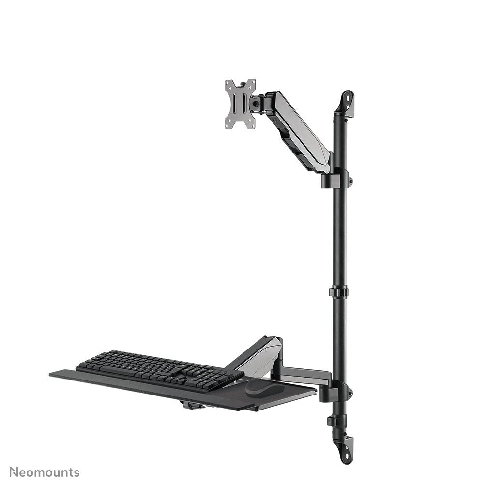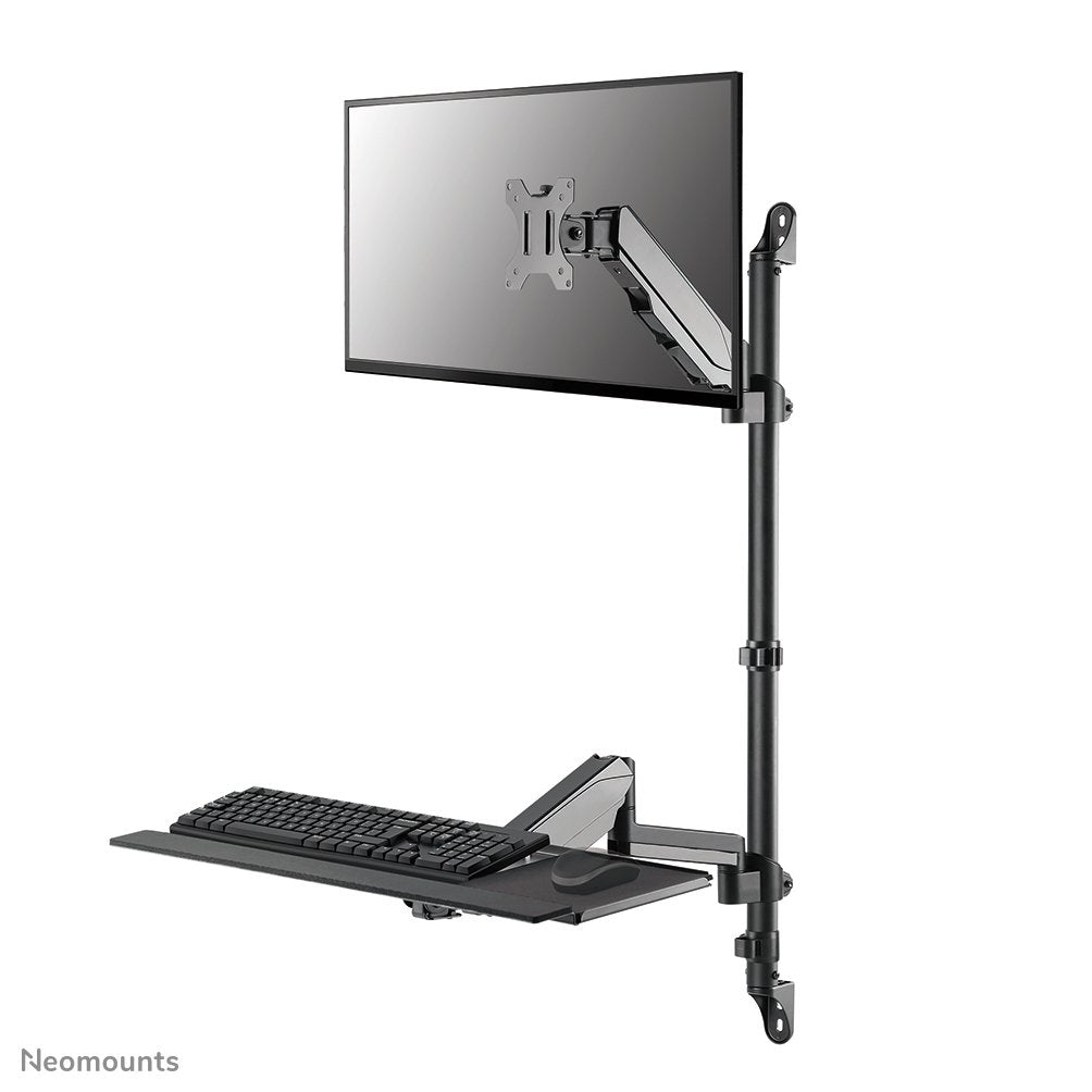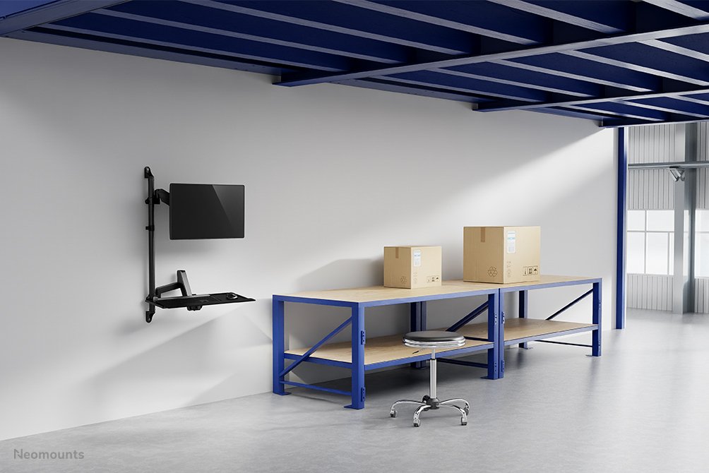 El Neomounts WL90-325BL1 es una estacion de trabajo de pared de altura ajustable para pantallas de hasta 32", teclado y raton. El soporte puede soportar pantallas de hasta 9 kg (curvas: 6 kg), mientras que la bandeja del teclado puede soportar un máximo de 1 kg. 1 kg. La versátil tecnología de inclinación (70°), rotación (360°) y giro (180°) permite cambiar el brazo del monitor a cualquier ángulo de visión para aprovechar al máximo las capacidades de la pantalla. La bandeja para el teclado incluye un reposamuñecas y una alfombrilla para el ratón para una comodidad óptima.