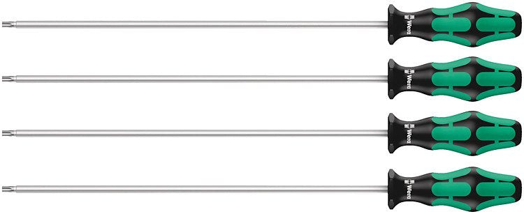 Juego de destornilladores de 4 piezas de Wera. Con varilla extra-larga para entornos de montaje profundos y de alcance difícil. Con un mango Kraftform multicomponente para un trabajo rápido y ergonómico. Kraftform Plus: las zonas duras de agarre permiten una gran velocidad de trabajo mientras que las zonas blandas de agarre garantizan la transmisión de altos pares de giro. Con función de retención: gracias a la fuerza de apriete que resulta de la fuerza de presión superficial entre la punta de salida y el perfil del tornillo, los tornillos se mantienen de forma segura en la herramienta. El sistema de protección contra el rodamiento evita las molestias que conlleva el perder la herramienta que se rueda en el puesto de trabajo. Lleva la marcación correspondiente en el mango para encontrar y clasificar los útiles más fácilmente.