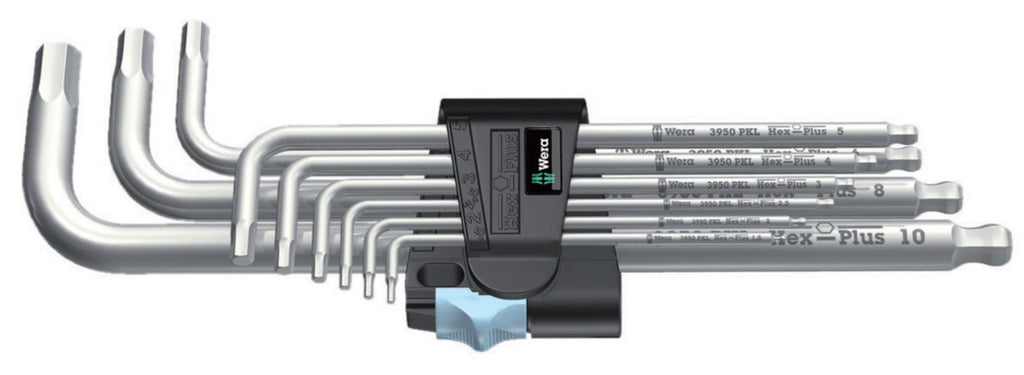 Juego de llaves acodadas de alta calidad de acero inoxidable para tornillos de hexágono interior de Wera. El acero inoxidable evita el contagio con la herrumbre de origen externo. Hex-Plus ofrece mayores superficies de apoyo dentro de la cabeza del tornillo. Así se reduce a un mínimo el efecto de entalladura y la destrucción de la cabeza del tornillo se evita casi por completo. Con cabeza esférica de hexágono en el brazo largo: gracias a los perfiles esféricos de salida es posible desviar o girar el eje de la herramienta hacia el eje del tornillo. De esta forma se pueden realizar trabajos de atornillar "doblando la esquina". El juego se ofrece en el práctico clip de material resistente que es prácticamente libre de desgaste.