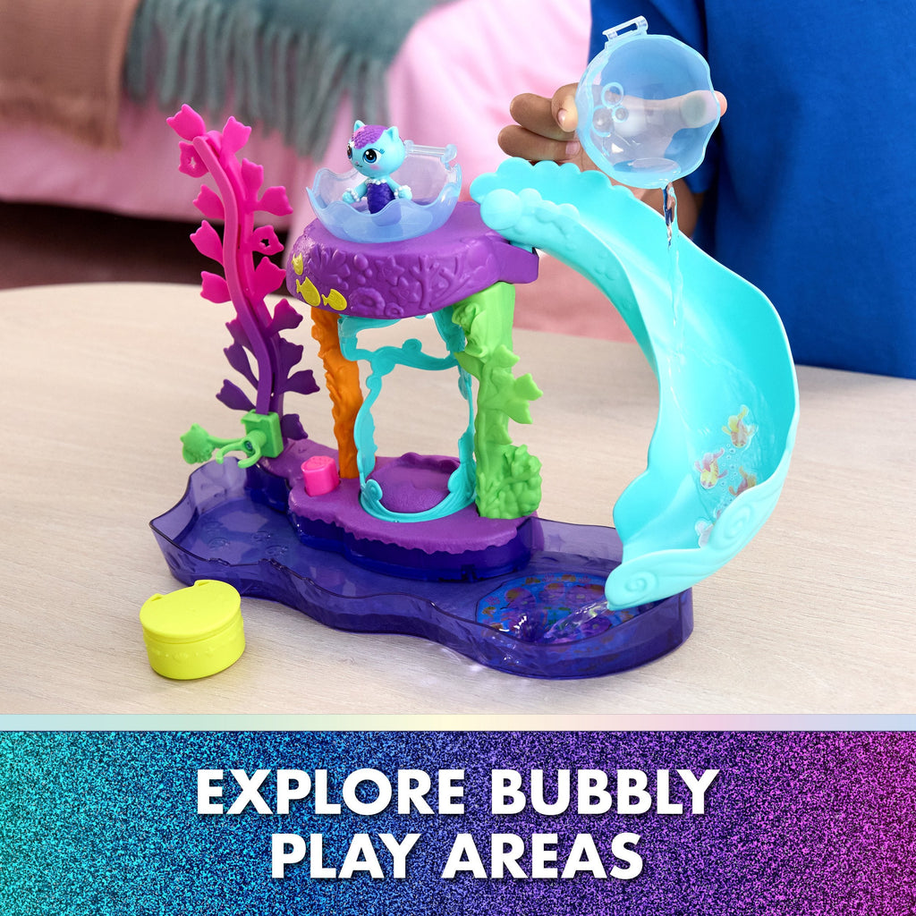 Adéntrate en el mágico universo de Gabby’s Dollhouse: The Movie (La casa de muñecas de Gabby: La película) con el Set de juego de colorido acuario de MerCat. Este adorable set tiene cuatro zonas de juego que los niños podrán explorar, como una burbuja de plástico transparente con tapa extraíble para juegos de ocultar y revelar, y bonitos accesorios. Gira los peces y los corales alrededor de Gabby en la plataforma pulsando el botón Paw Bump Magic o monta a Gabby en el ascensor de algas marinas. La imaginación de los peques volará mientras Gabby y Gatirena se deslizan por el tobogán de agua con diseños que cambian de color y disfrutan de un chapuzón gatástico. Realiza exploraciones miau-sombrosas con estos formidables juguetes educativos. Al igual que hace Gabby en la serie, abre la caja sorpresa para encontrar un accesorio sorpresa y escanea el código QR para desbloquear una sorpresa en la aplicación Gabby’s Dollhouse. Este divertido set inspira juegos de imitación y exploraciones miau-sombrosas con bonitos juguetes de gatos de Gabby para niños. Estos juguetes son un gran regalo que permite a los peques volver a vivir sus momentos favoritos de la película y crear otras aventuras de La casa de muñecas de Gabby con juguetes para niñas pequeñas como los accesorios y muebles de la casa, sus miau-sombrosos gatos y mar-avillosos juguetes de sirenas con los que disfrutarán de montones de horas de diversión (se venden por separado).